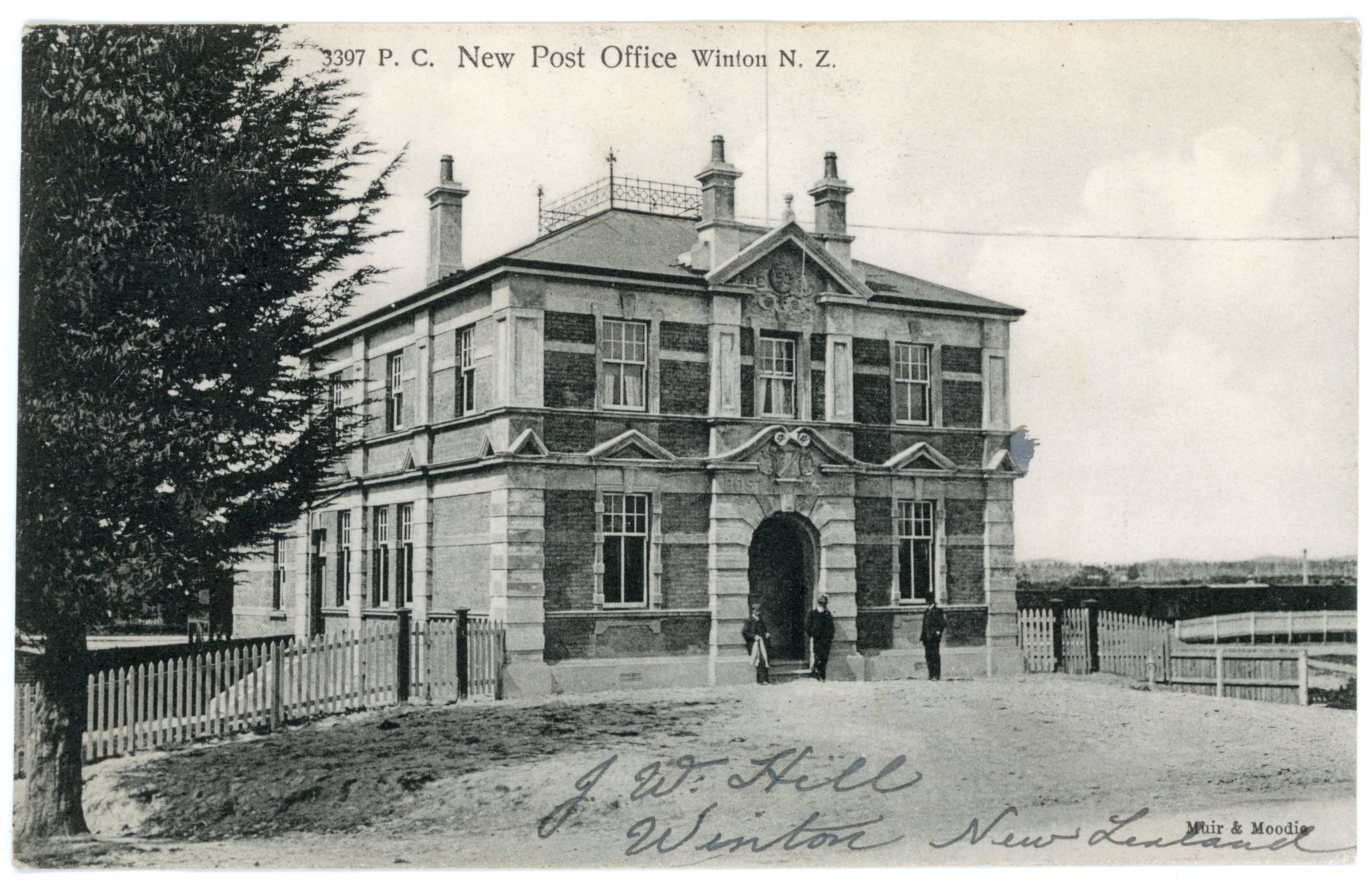 Back of Postcard - Mr F. De Boessieu Chateau de la Foret Toulon sur Allier France. [number 3 hand written] I am sending 3 p.p.[photographic postcard?] cards please send views of your town hope you are quite well from J.W. Hill Winton New Zealand. Issued by Muir & Moodie Dunedin NZ from their Copyright Series of Views.