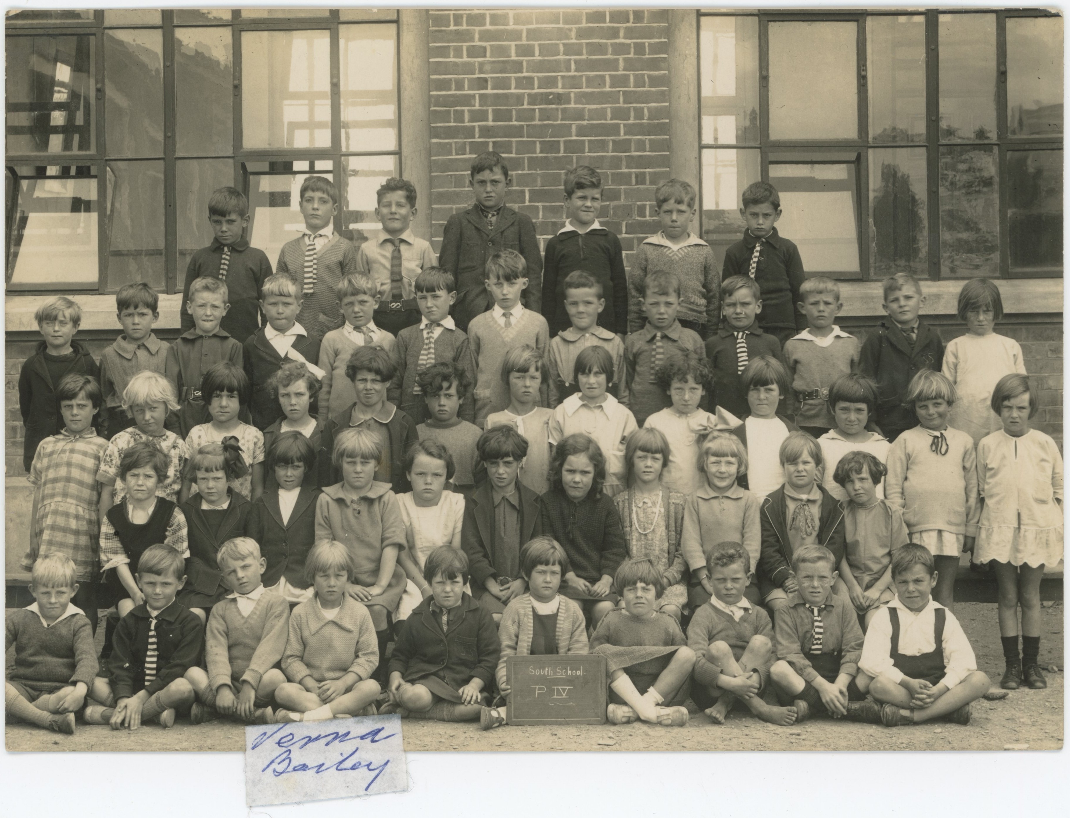 South School P IV class photo. Verna Fraser (nee Bailey) fourth from left in first row from bottom.