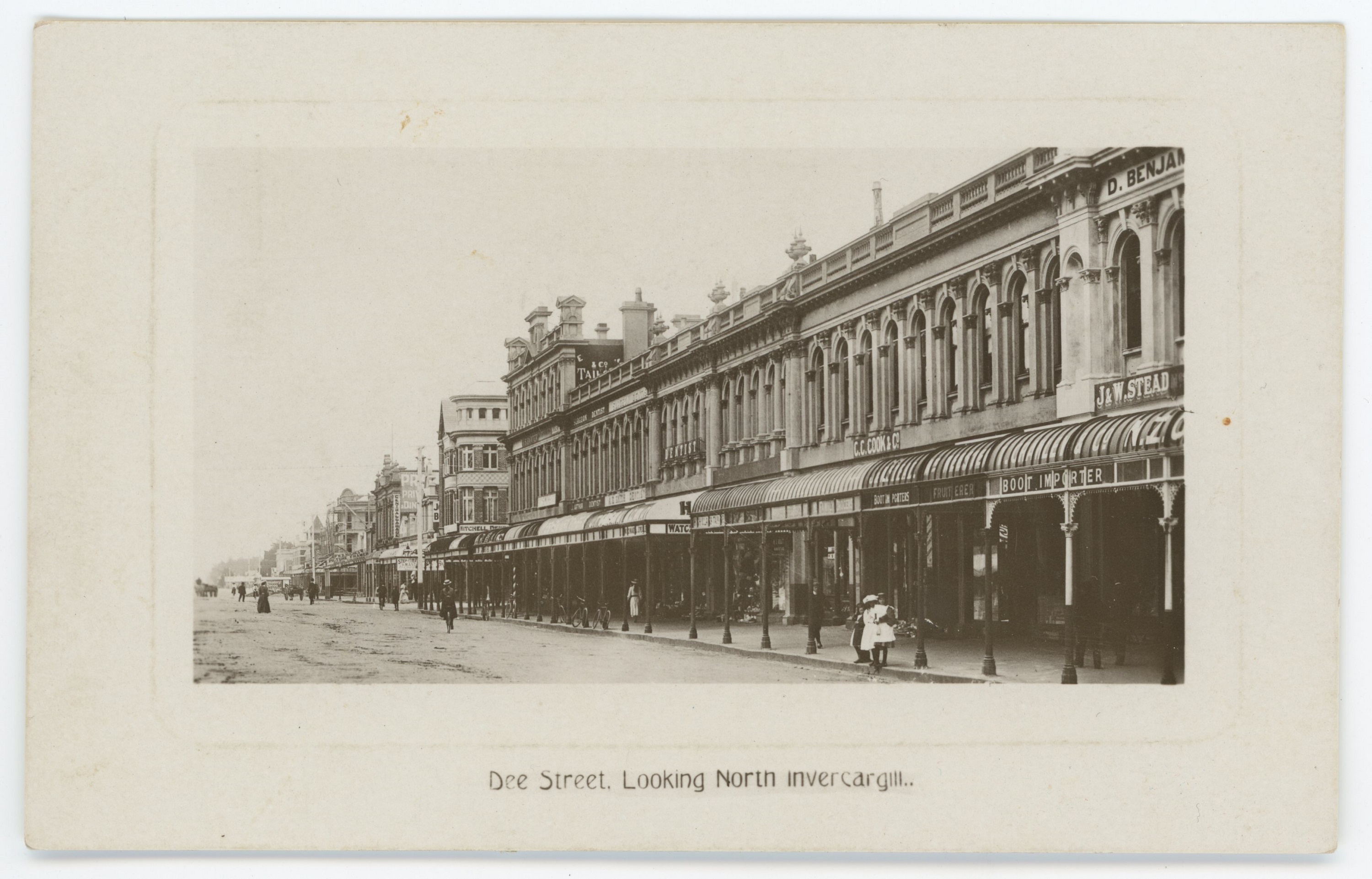 View from Dee Street looking towards North Invercargill. Includes few people walking on the streets and near the shops.